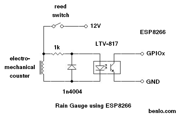 An LTV-817 optoisolator keeps the ESP board safe from harm. In this case, the electromechanical counter is still in the circuit, so there are considerable inductive surges to worry about. In fact, a reverse diode was connected across the LED of the optoisolator to protect it from excessive reverse voltage.