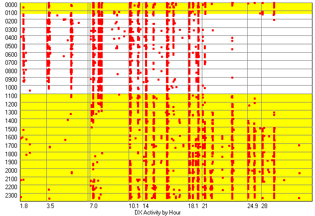 The activity from 3Y0X by band by time of day in these scatter plots clearly shows that this was a 24/7 operation. [History Window: Plot - Activity by Day]. The yellow shading represents daylight hours at 3Y0. [History Window: Plot - Activity by Hour].