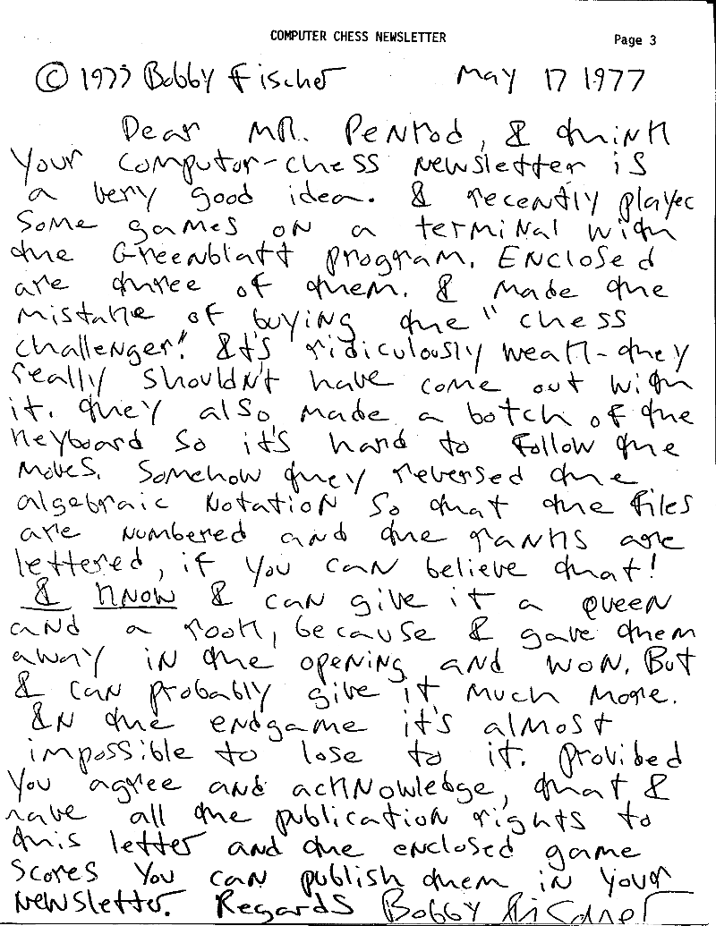 On a cold winter afternoon in February, I was sitting at my desk in Toronto when the phone rang. I picked it up and a voice stated bluntly, "This is Bobby Fischer". After I picked myself off the floor, we had a conversation. He was calling because he wanted to play a game against the latest Microchess, which had been mentioned in the Computer Chess Newsletter. I explained that it would require setting up the computer so it would not be possible at that moment, but if he called back tomorrow at the same time, I would be ready to convey his moves and relay the responses.