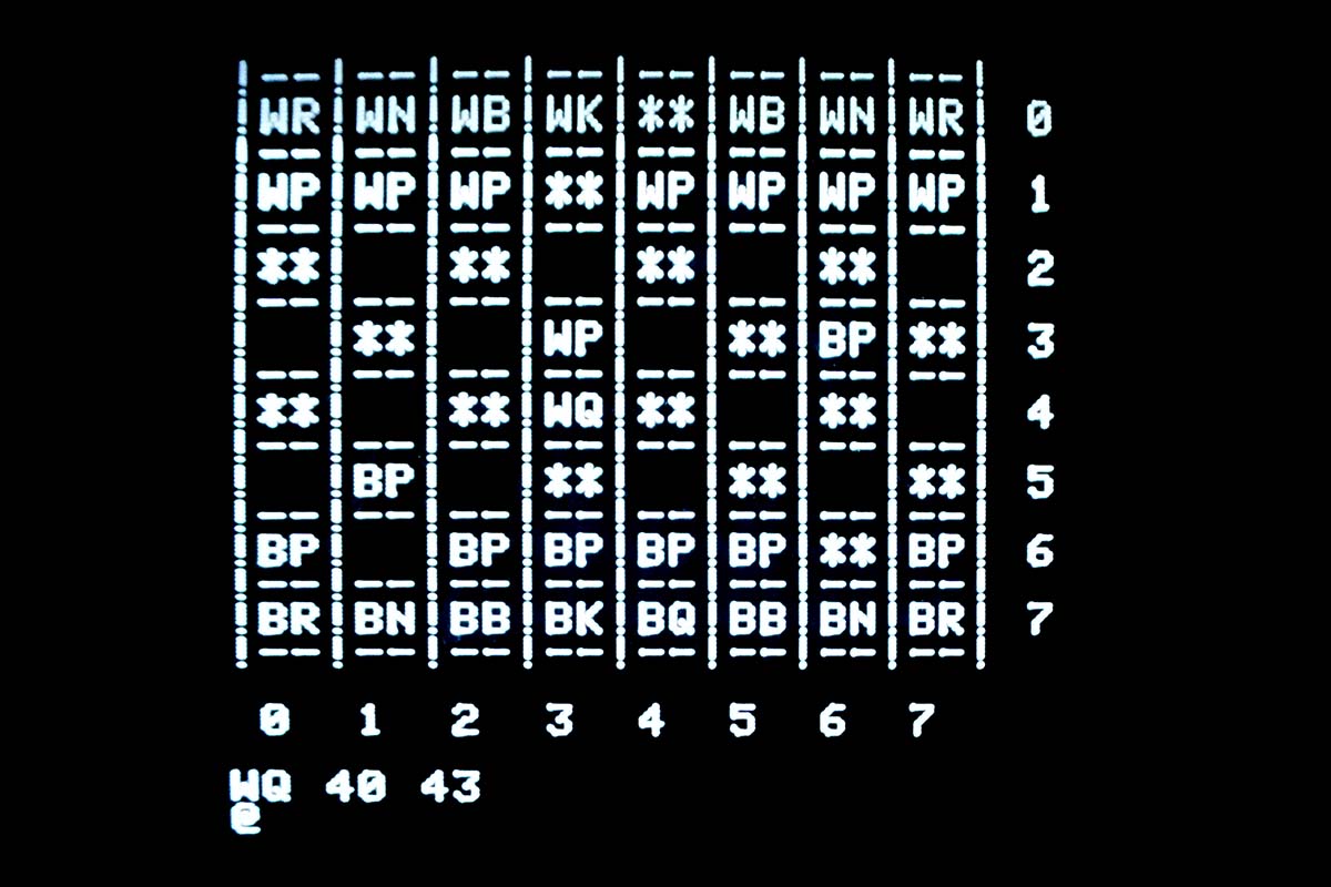 Week by week, the program progressed. At first, it would make legal moves, but they didn't make much sense. The first time I demonstrated it to my brother-in-law, it insisted on marching all of its pawns down the board as quickly as possible, regardless of any other positional strategy.